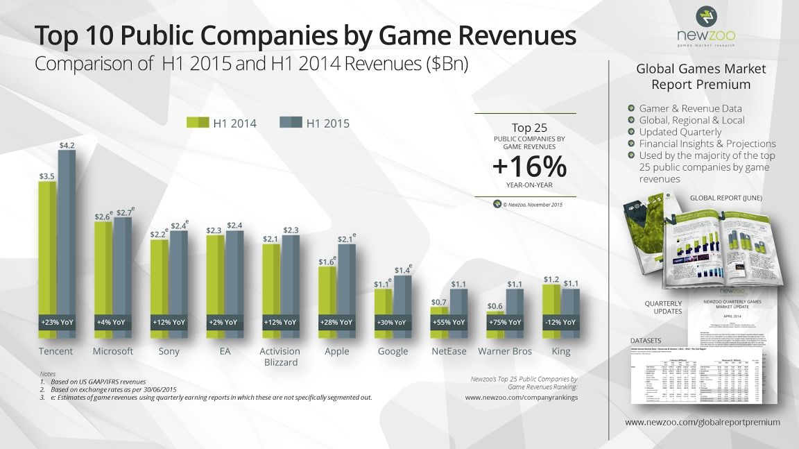 El ranking lo lidera la china Tencent que a lo largo de la primera mitad de 2015 ha conseguido obtener 4.200 millones de dólares en una oferta de lanzamientos principalmente focalizada en PC. Microsoft, por su parte, se sitúa en segundo puesto con 2.700 millones de dólares, cifra especialmente meritoria puesto que no tiene en cuenta lanzamientos tan importantes como los de los últimos meses para los de Redmond, entre los que se cuenta el millonarioHalo 5: Guardians.