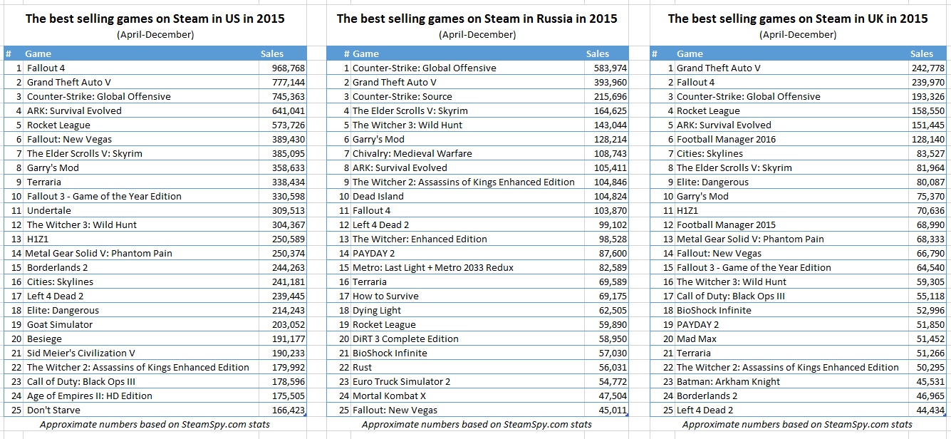 Conviene dejar claro que estos datos no son oficiales, sino cifras que baraja Steam Spy en base a los perfiles públicos de los usuarios en Steam. Además, confirma Sergey Galyonkin, solo tiene en cuenta los datos registrados entre el 1 de abril y el 20 de diciembre de 2015, pues no pudo obtener los de los primeros meses del año.