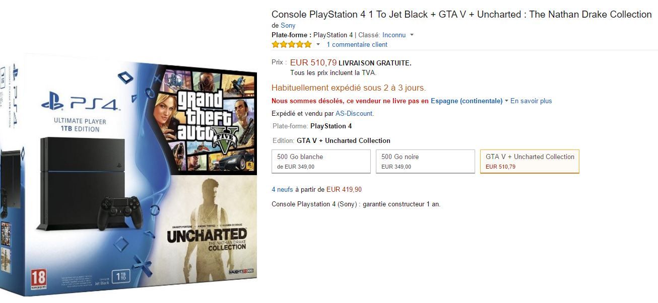 Tampoco hay forma de que este pack se pueda enviar a nuestro país, por lo que de momento no lo intentés, además, de incluir las ediciones físicas de ambos juegos, como es lógico, estarán editadas en idioma francés. En cualquier caso, se trata de uno de los packs más destacados de la PS4 de 1TB en la actualidad, incluyendo dos títulos que nos pueden dar para muchos meses de juego, porque no olvidemos que además del ya de por sí largo GTA V, también incluye toda la recopilación de juego de Uncharted aparecidos hasta ahora, y que nos servirán de aperitivo para la llegada de Uncharted 4.