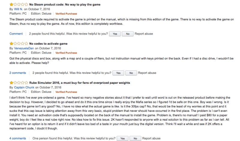 La edición física de Mafia III está distribuida en seis discos, que al ser instalados necesitan de una clave que les permite disfrutar de la obra. Dicho código está en las instrucciones, pero parece que muchas unidades de la edición de lujo de PC llegarón sin el manual, circunstancia que está obligando a 2K a tomar medidas para poner una solución rápida ante los compradores afectados.