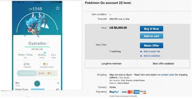 Las ventas de estos perfiles de Pokémon GO habrían llegado a tiendas como Craiglist o eBay, presentando numerosos precios que van desde unos pocos dólares a cuentas que se subastan por miles de dólares. Estas cuentas, que se venden utilizando como reclamo un gran nivel y la captura de Pokémon de distinta rareza, estarían alcanzando cotas de hasta 3.000 dólares.