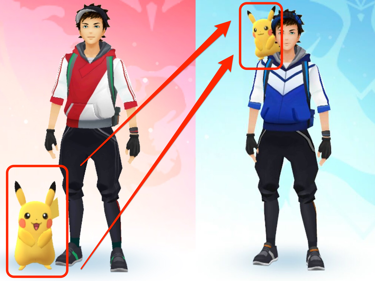 En definitiva, en vez de ir a su lado, tras 10 kilómetros se ubicará en el hombro del jugador. Este cambio es una referencia a la serie Pokémon, cuando Ash debió trabajar mucho para conseguir el cariño de su Pikachu.