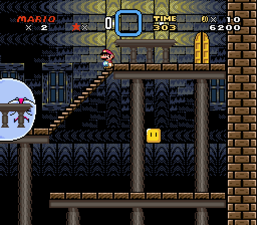 Para ello, simplemente tendremos que deslizarnos por cualquier escalera (ya sea de frente o hacia atrás) e impactar sobre el gigantesco fantasma. Es más, esta técnica también funciona contra las burbujas verdes de una de las fases del juego (también ambientada en una mansión encantada).