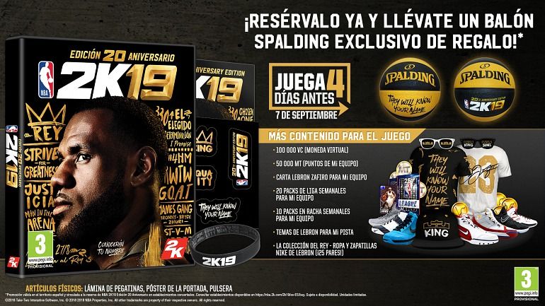 Los usuarios españoles que reserven el videojuego recibirán un balón Spalding exclusivo creado especialmente para la ocasión. NBA 2K19 no ha ofrecido por el momento detalles sobres sus novedades jugables. Sus responsables han confirmado el estreno del simulador deportivo en PC, PS4, Xbox One y Nintendo Switch aunque, eso sí, el lanzamiento físico de la Edición 20 Aniversario sólo se podrá adquirir en las consolas de Sony y Microsoft quedando como digital para el resto.